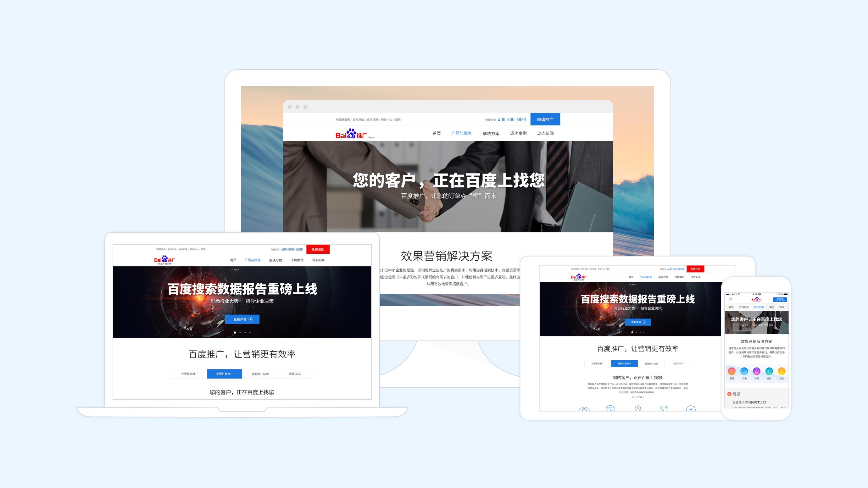 我们精心的对百度推广用户涉及到的多数PC和移动端都进行了专门的UI优化设计,让用户在每一个端都能得到一致的高质量UI体验。