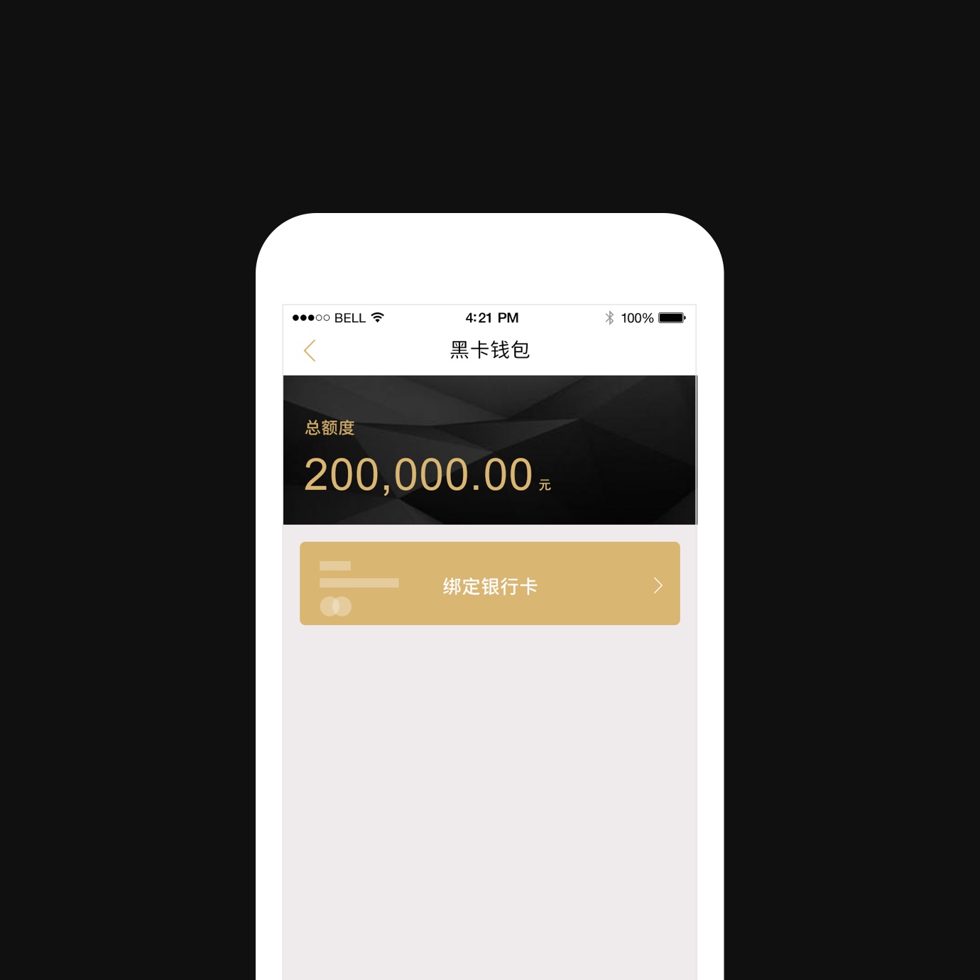 “黑卡“名字的来源于最高端的信用卡,因此如何将现实中的黑卡“一卡在手,万事无忧”的现实体验转化到APP上,是我们最大的设计挑战,TUYI团队经过不断演化探索,设计了一个看似“无卡”但却非常简洁的虚拟“黑卡”主界面。